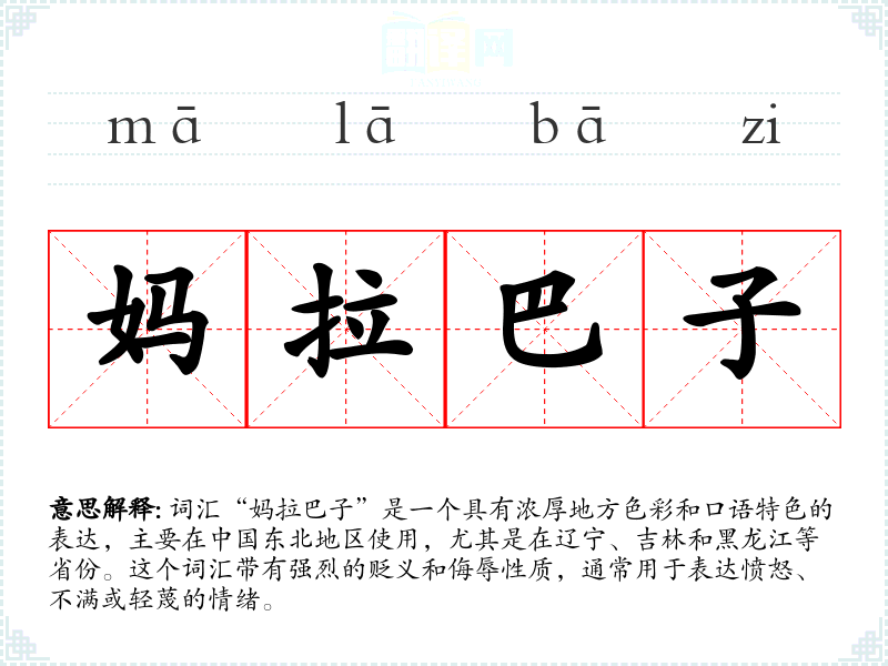 词汇“妈拉巴子”是一个具有浓厚地方色彩和口语特色的表达,主要在**东北地区使用,尤其是在辽宁、吉林和黑龙江等省份。这个词汇带有强烈的贬义和侮辱性质,通常用于表达愤怒、不满或轻蔑的情绪。