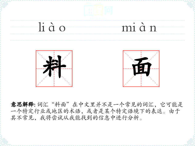 词汇“料面”在中文里并不是一个常见的词汇,它可能是一个特定行业或地区的术语,或者是某个特定语境下的表达。由于其不常见,我将尝试从我能找到的信息中进行分析。
