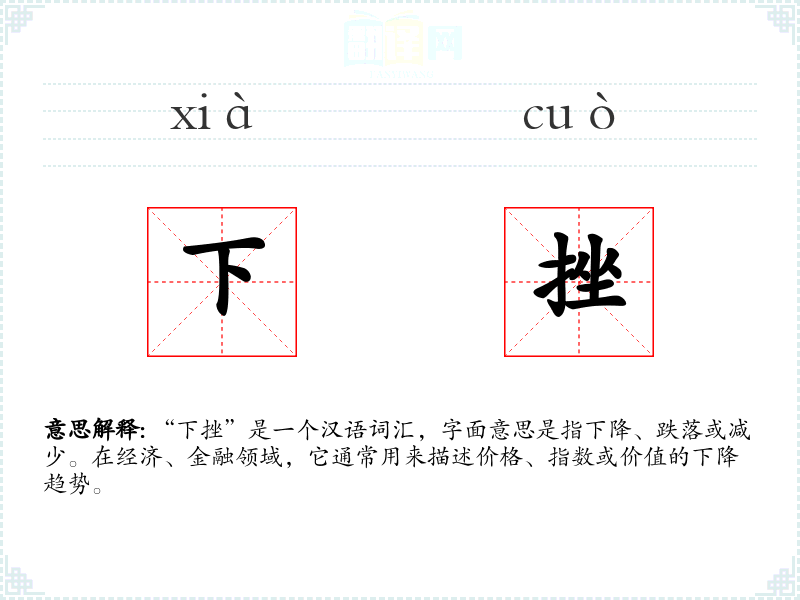“下挫”是一个汉语词汇,字面意思是指下降、跌落或减少。在经济、金融领域,它通常用来描述价格、指数或价值的下降趋势。
