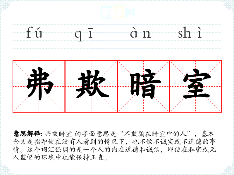 弗欺暗室 的字面意思是“不欺骗在暗室中的人”,基本含义是指即使在没有人看到的情况下,也不做不诚实或不道德的事情。这个词汇强调的是一个人的内在道德和诚信,即使在私密或无人监督的环境中也能保持正直。