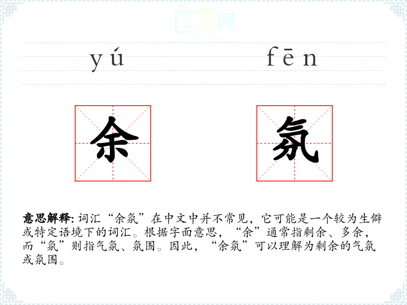 词汇“余氛”在中文中并不常见,它可能是一个较为生僻或特定语境下的词汇。根据字面意思,“余”通常指剩余、多余,而“氛”则指气氛、氛围。因此,“余氛”可以理解为剩余的气氛或氛围。
