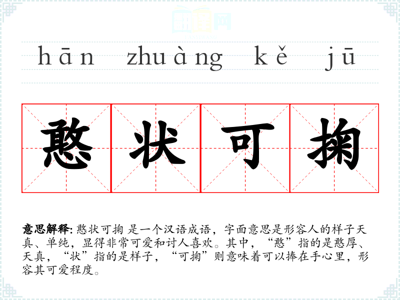 憨状可掬 是一个汉语成语,字面意思是形容人的样子天真、单纯,显得非常可爱和讨人喜欢。其中,“憨”指的是憨厚、天真,“状”指的是样子,“可掬”则意味着可以捧在手心里,形容其可爱程度。