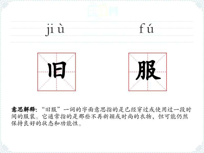- 口语:在日常对话中,“旧服”通常指的是不再穿的衣物,可能是因为过时或破损。