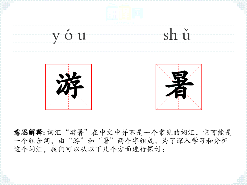 词汇“游暑”在中文中并不是一个常见的词汇,它可能是一个组合词,由“游”和“暑”两个字组成。为了深入学*和分析这个词汇,我们可以从以下几个方面进行探讨: