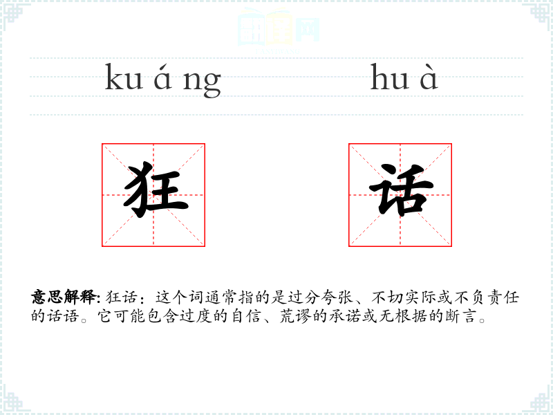 狂话:这个词通常指的是过分夸张、不切实际或不负责任的话语。它可能包含过度的自信、荒谬的承诺或无根据的断言。