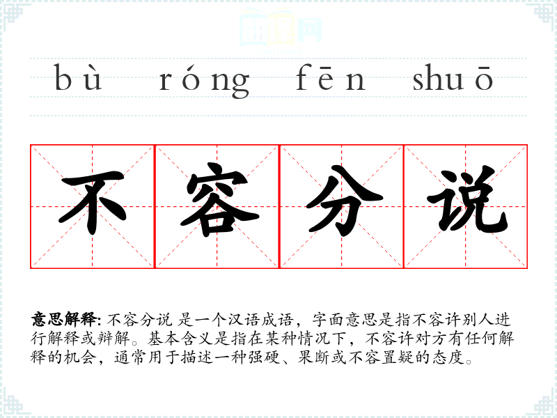 不容分说 是一个汉语成语,字面意思是指不容许别人进行解释或辩解。基本含义是指在某种情况下,不容许对方有任何解释的机会,通常用于描述一种强硬、果断或不容置疑的态度。