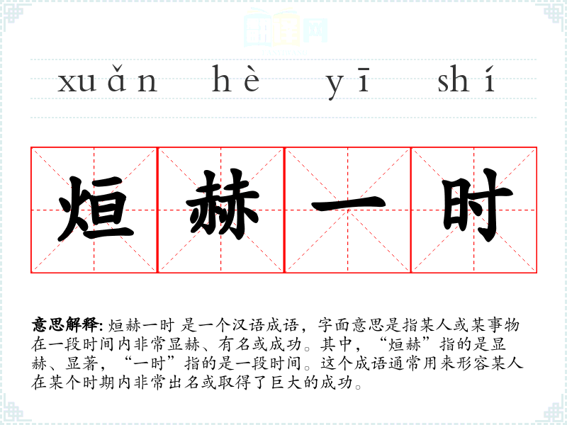 烜赫一时 是一个汉语成语,字面意思是指某人或某事物在一段时间内非常显赫、有名或成功。其中,“烜赫”指的是显赫、显著,“一时”指的是一段时间。这个成语通常用来形容某人在某个时期内非常出名或取得了巨大的成功。