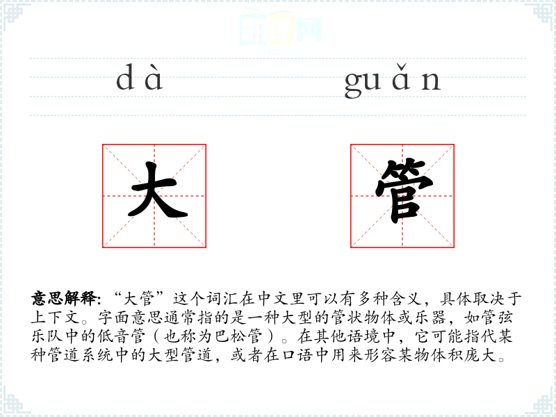 - 口语:在日常对话中,“大管”可能被用来形容某人的体型或某物的尺寸,例如“他是个大管子”可能意味着某人非常胖。