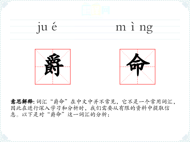 “爵命”这一词汇虽然不常见,但它反映了古代社会的特定历史和文化背景。在学*语言和表达时,了解这样的词汇可以帮助我们更好地理解历史和文化,丰富我们的语言知识。