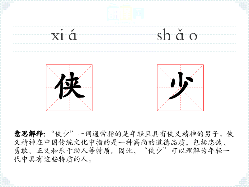 “侠少”一词通常指的是年轻且具有侠义精神的男子。侠义精神在**传统文化中指的是一种高尚的道德品质,包括忠诚、勇敢、正义和乐于助人等特质。因此,“侠少”可以理解为年轻一代中具有这些特质的人。