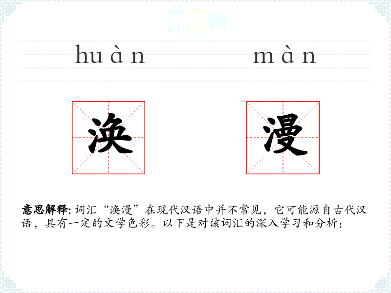 词汇“涣漫”在现代汉语中并不常见,它可能源自古代汉语,具有一定的文学色彩。以下是对该词汇的深入学*和分析: