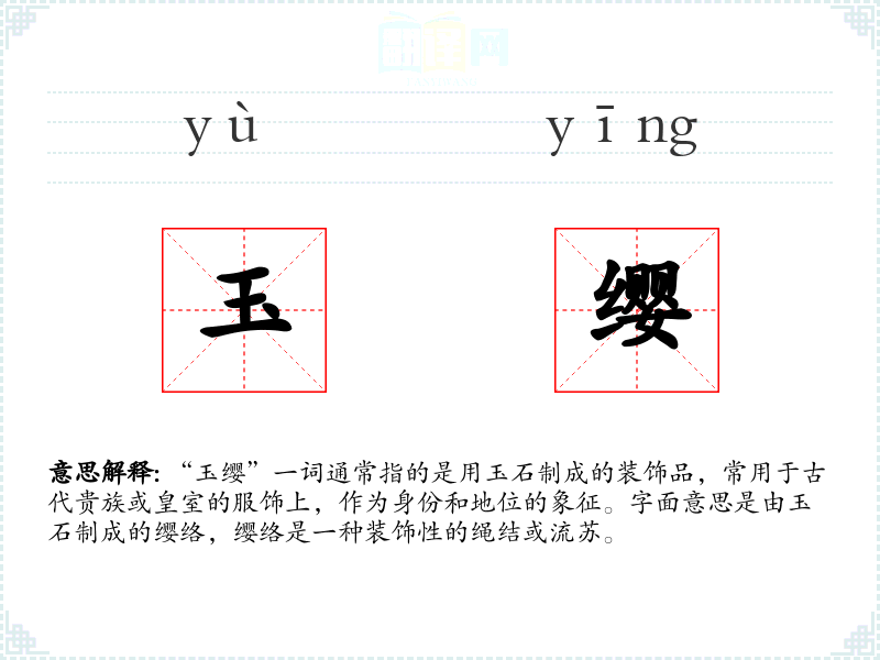 同义词:玉饰、玉佩、玉坠 反义词:(由于“玉缨”特指一种高贵的装饰品,反义词可能不太适用,但可以考虑一些朴素的装饰品,如草编饰品)