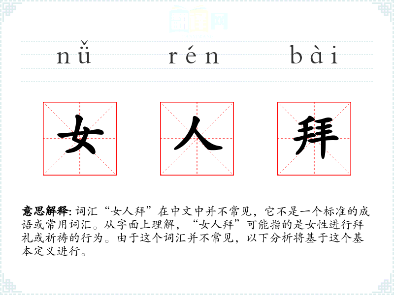 词汇“女人拜”在中文中并不常见,它不是一个标准的成语或常用词汇。从字面上理解,“女人拜”可能指的是女性进行拜礼或祈祷的行为。由于这个词汇并不常见,以下分析将基于这个基本定义进行。