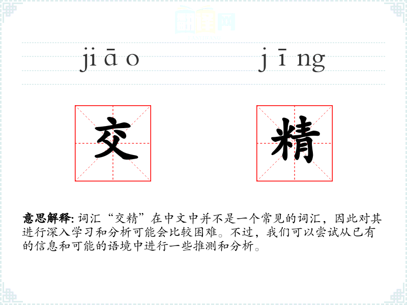 词汇“交精”在中文中并不是一个常见的词汇,因此对其进行深入学习和分析可能会比较困难。不过,我们可以尝试从已有的信息和可能的语境中进行一些推测和分析。