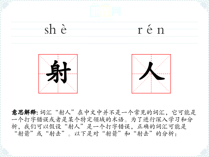 词汇“射人”在中文中并不是一个常见的词汇,它可能是一个打字错误或者是某个特定领域的术语。为了进行深入学*和分析,我们可以假设“射人”是一个打字错误,正确的词汇可能是“射箭”或“射击”。以下是对“射箭”和“射击”的分析: