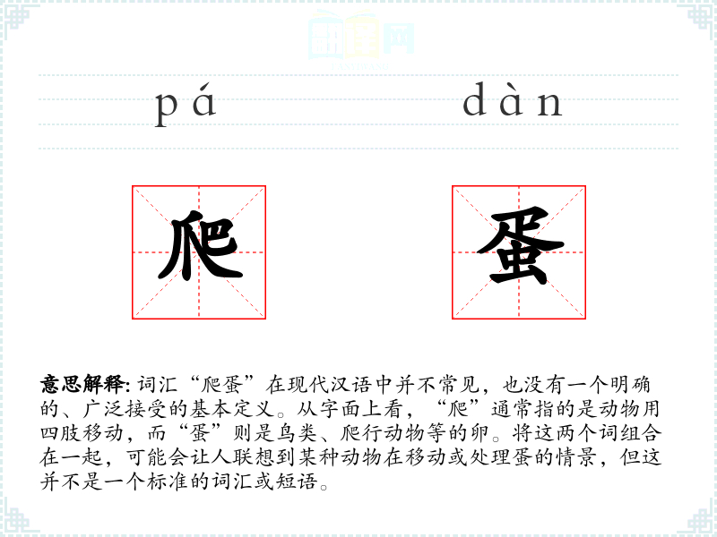 词源与演变方面,没有关于“爬蛋”的历史记录或演变过程,因为它不是一个传统或标准的词汇。