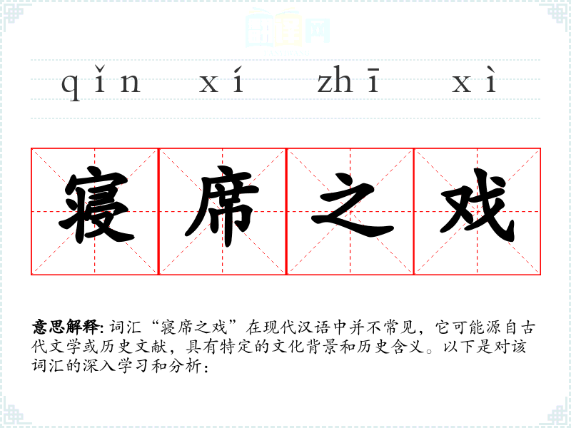 “寝席之戏”是一个具有特定历史和文化背景的词汇,虽然在现代汉语中不常用,但它对于理解古代文化和历史具有重要意义。在学*语言和表达时,了解这样的词汇可以帮助我们更深入地理解语言的丰富性和历史背景。