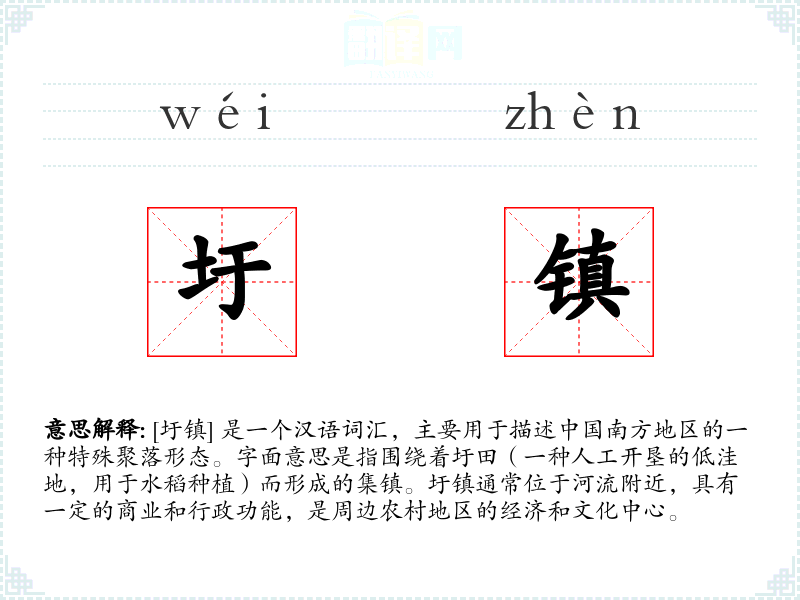 [圩镇] 是一个汉语词汇,主要用于描述**南方地区的一种特殊聚落形态。字面意思是指围绕着圩田(一种人工开垦的低洼地,用于水稻种植)而形成的集镇。圩镇通常位于河流附近,具有一定的商业和行政功能,是周边农村地区的经济和文化中心。