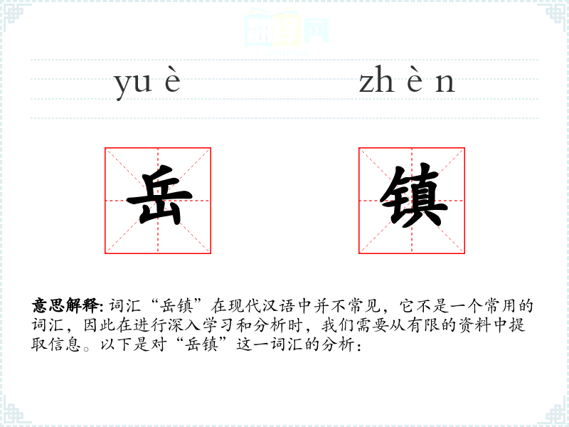 词汇“岳镇”在现代汉语中并不常见,它不是一个常用的词汇,因此在进行深入学*和分析时,我们需要从有限的资料中提取信息。以下是对“岳镇”这一词汇的分析: