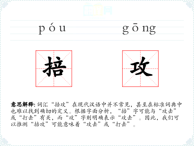 词汇“掊攻”在现代汉语中并不常见,甚至在标准词典中也难以找到确切的定义。根据字面分析,“掊”字可能与“攻击”或“打击”有关,而“攻”字则明确表示“攻击”。因此,我们可以推测“掊攻”可能意味着“攻击”或“打击”。