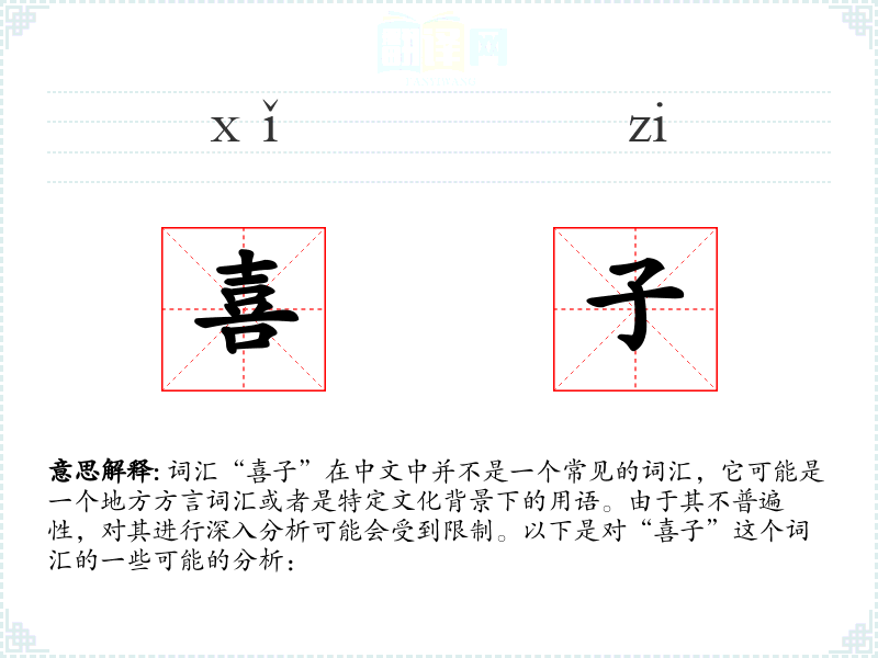 由于“喜子”不是一个标准汉语词汇,它的字面意思和基本含义可能需要结合具体语境来解释。通常,“喜”字在中文中表示高兴、喜悦,而“子”字常用于构成名词,如“儿子”、“桌子”等。因此,“喜子”可能指的是一个带来喜悦的人或物,或者是一个昵称,表示对某人的喜爱。