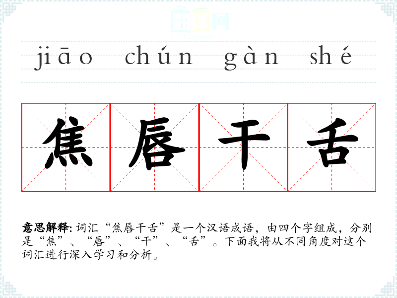 词汇“焦唇干舌”是一个汉语成语,由四个字组成,分别是“焦”、“唇”、“干”、“舌”。下面我将从不同角度对这个词汇进行深入学*和分析。