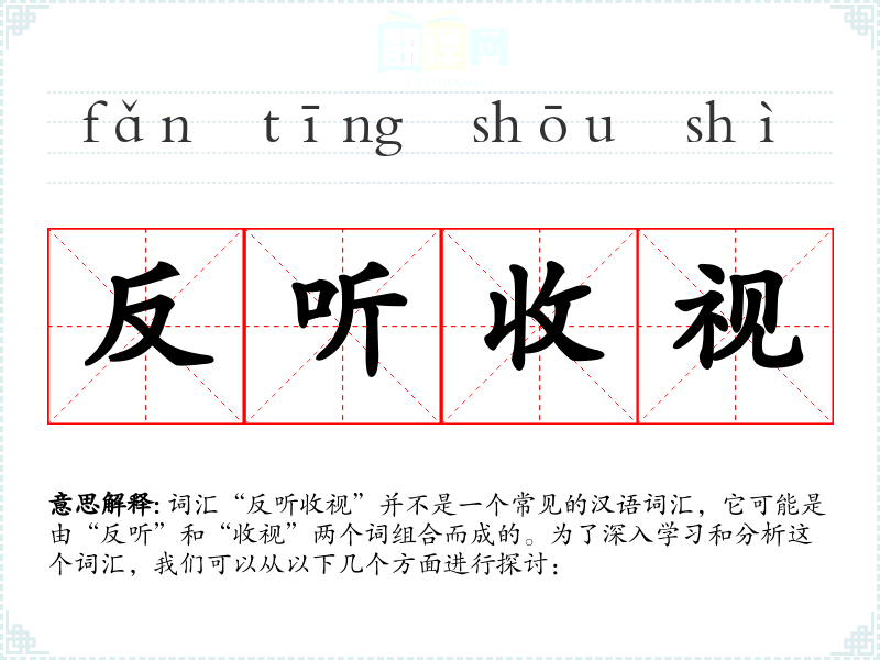 词汇“反听收视”并不是一个常见的汉语词汇,它可能是由“反听”和“收视”两个词组合而成的。为了深入学习和分析这个词汇,我们可以从以下几个方面进行探讨: