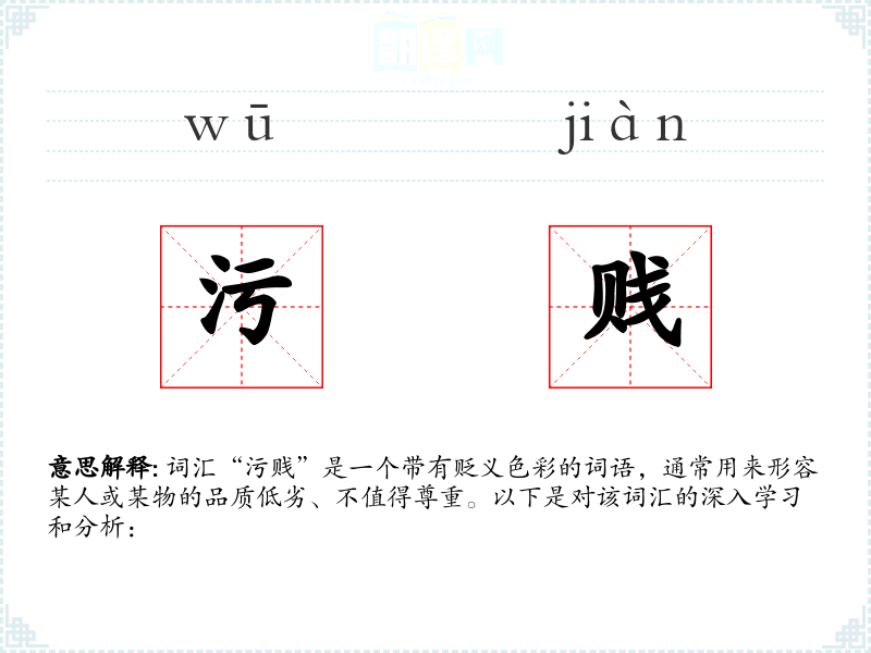 - 字面意思:由“污”和“贱”两个字组成,“污”指脏、不干净,“贱”指低贱、不值钱。