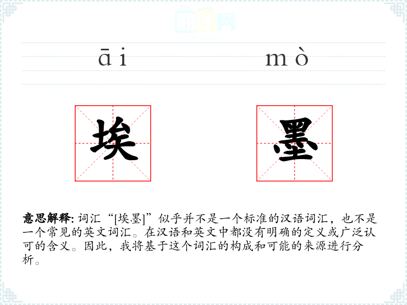 由于“[埃墨]”不是一个已知的词汇,我们无法提供一个确切的基本定义。它可能是由两个汉字“埃”和“墨”组成,但这两个字组合在一起并没有明确的意义。