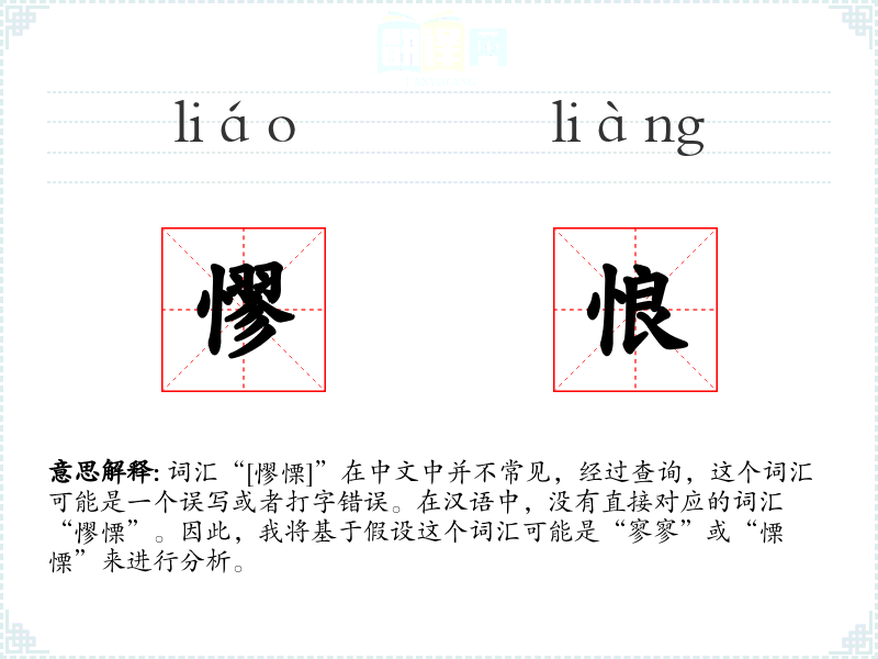 词汇“[憀慄]”在中文中并不常见,经过查询,这个词汇可能是一个误写或者打字错误。在汉语中,没有直接对应的词汇“憀慄”。因此,我将基于假设这个词汇可能是“寥寥”或“慄慄”来进行分析。