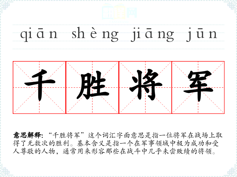 “千胜将军”这个词汇字面意思是指一位将军在战场上取得了无数次的胜利。基本含义是指一个在军事领域中极为成功和受人尊敬的人物,通常用来形容那些在战斗中几乎未尝败绩的将领。