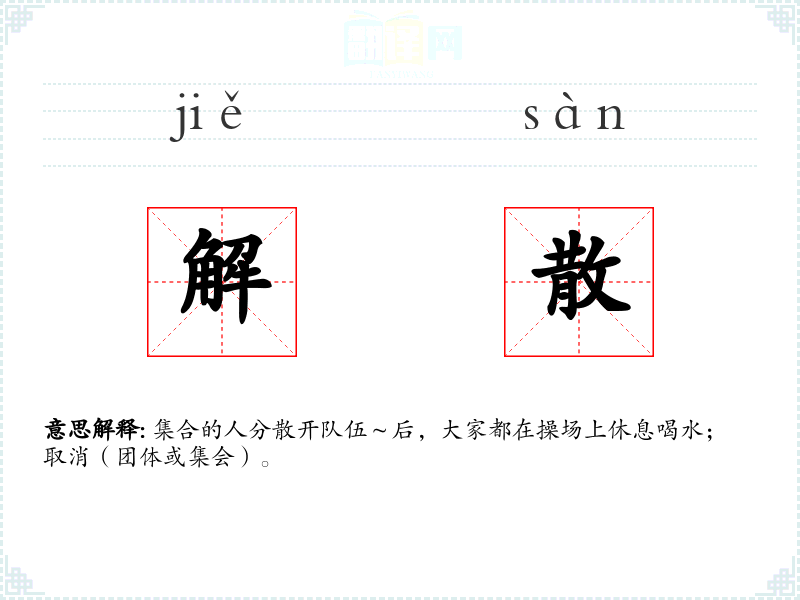集合的人分散开队伍~后,大家都在操场上休息喝水; 取消(团体或集会)。