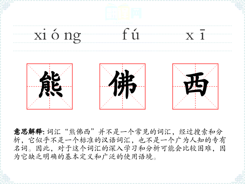 - 对于“熊佛西”这个词汇,可能会有一些基于字面意思的联想,比如与熊的强壮、佛的智慧和西方的神秘感相关联。