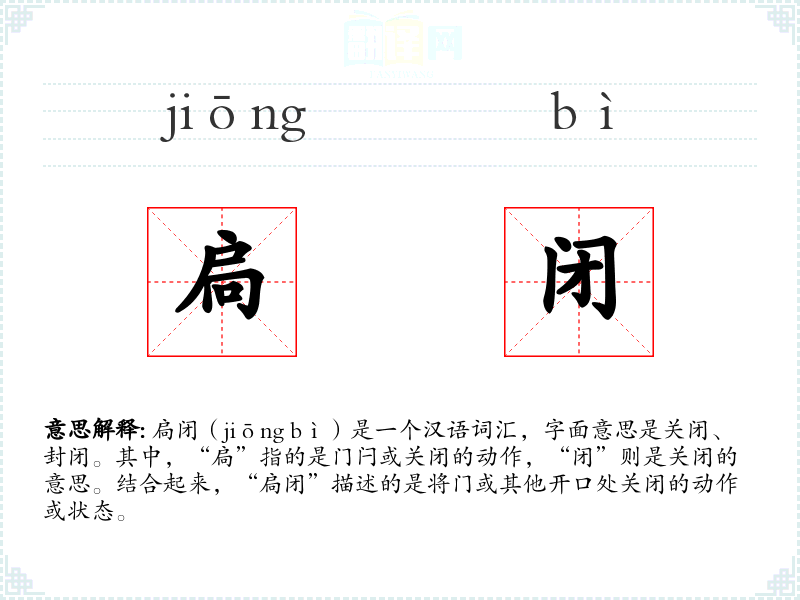 扃闭(jiōng bì)是一个汉语词汇,字面意思是关闭、封闭。其中,“扃”指的是门闩或关闭的动作,“闭”则是关闭的意思。结合起来,“扃闭”描述的是将门或其他开口处关闭的动作或状态。