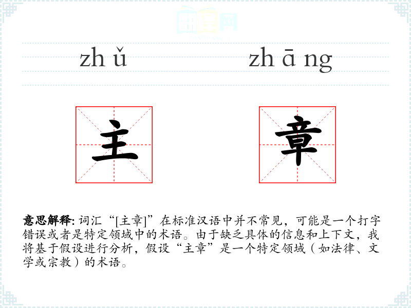 词汇“[主章]”在标准汉语中并不常见,可能是一个打字错误或者是特定领域中的术语。由于缺乏具体的信息和上下文,我将基于假设进行分析,假设“主章”是一个特定领域(如法律、文学或**)的术语。