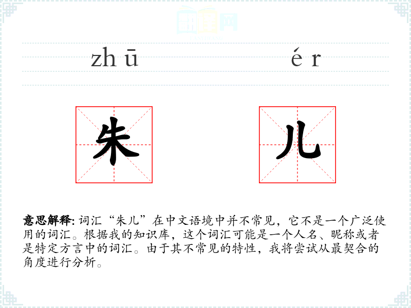 “朱儿”可能是一个人的名字或者昵称,其中“朱”是一个常见的姓氏,“儿”在中文中常用来表示亲昵或者小名。