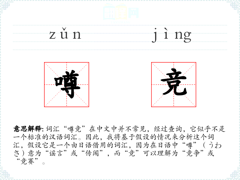 词汇“噂竞”在中文中并不常见,经过查询,它似乎不是一个标准的汉语词汇。因此,我将基于假设的情况来分析这个词汇,假设它是一个由日语借用的词汇,因为在日语中“噂”(うわさ)意为“谣言”或“传闻”,而“竞”可以理解为“竞争”或“竞赛”。