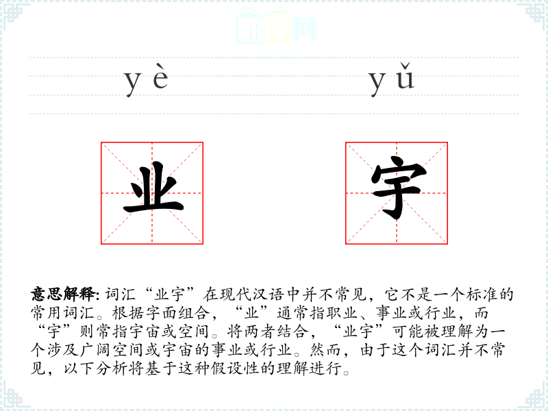 词汇“业宇”在现代汉语中并不常见,它不是一个标准的常用词汇。根据字面组合,“业”通常指职业、事业或行业,而“宇”则常指宇宙或空间。将两者结合,“业宇”可能被理解为一个涉及广阔空间或宇宙的事业或行业。然而,由于这个词汇并不常见,以下分析将基于这种假设性的理解进行。