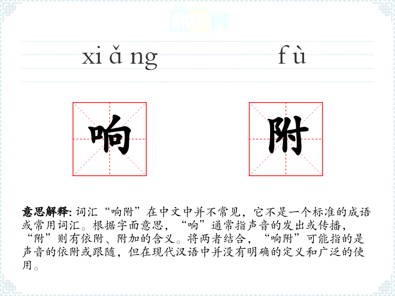 由于“响附”不是一个标准词汇,我们无法给出一个确切的基本定义。它可能是某个特定领域或方言中的词汇,或者是某个特定语境下的临时组合。