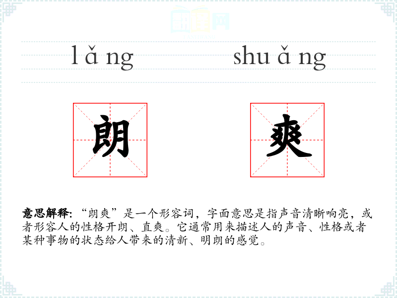 “朗爽”一词由“朗”和“爽”两个字组成。“朗”字古已有之,意为明亮、清晰;“爽”字则有清爽、直爽之意。两者结合,形成了“朗爽”这一词汇,用以形容声音或性格的明朗和直爽。