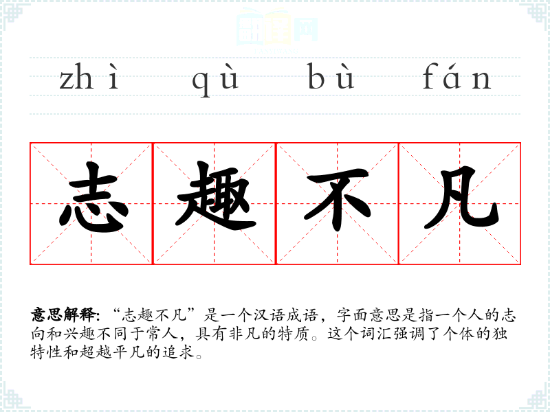 “志趣不凡”是一个汉语成语,字面意思是指一个人的志向和兴趣不同于常人,具有非凡的特质。这个词汇强调了个体的独特性和超越平凡的追求。