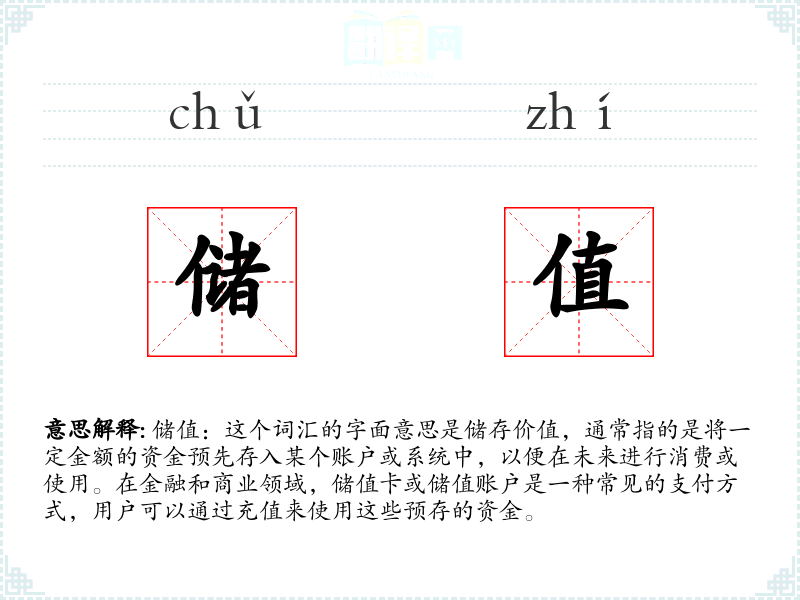储值:这个词汇的字面意思是储存价值,通常指的是将一定金额的资金预先存入某个账户或系统中,以便在未来进行消费或使用。在金融和商业领域,储值卡或储值账户是一种常见的支付方式,用户可以通过充值来使用这些预存的资金。