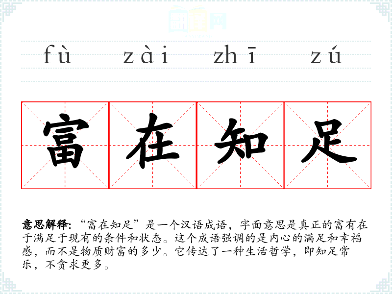 “富在知足”是一个汉语成语,字面意思是真正的富有在于满足于现有的条件和状态。这个成语强调的是内心的满足和幸福感,而不是物质财富的多少。它传达了一种生活哲学,即知足常乐,不贪求更多。