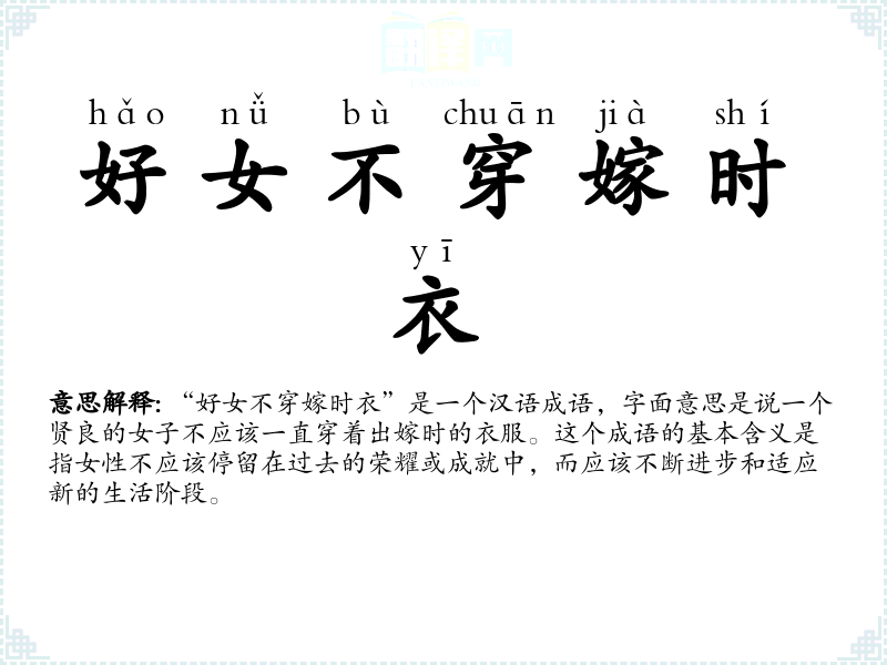 “好女不穿嫁时衣”是一个汉语成语,字面意思是说一个贤良的女子不应该一直穿着出嫁时的衣服。这个成语的基本含义是指女性不应该停留在过去的荣耀或成就中,而应该不断进步和适应新的生活阶段。