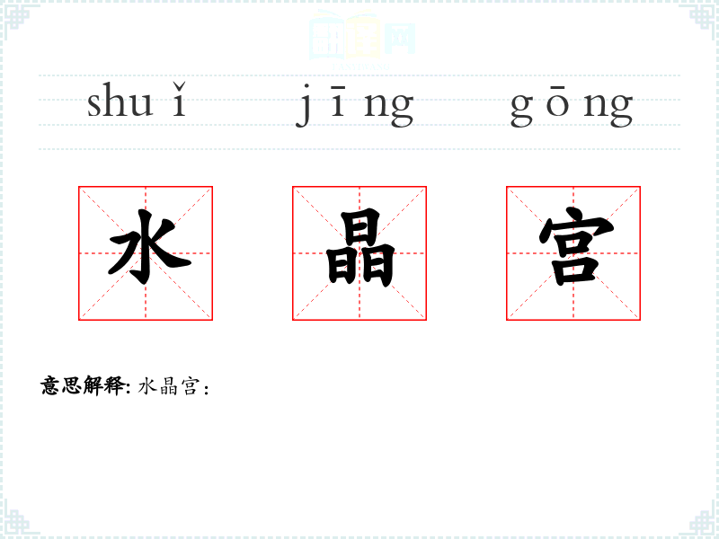 - 理解:水晶宫不仅是一个建筑概念,也是一个充满象征意义的词汇,常用于文学和艺术中,象征着美丽、纯净和透明。