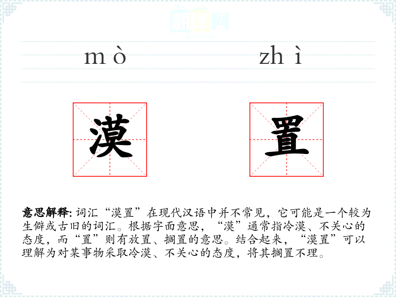 - 词源:“漠”源自古代汉语,意为沙漠,引申为冷漠;“置”源自古代汉语,意为放置。