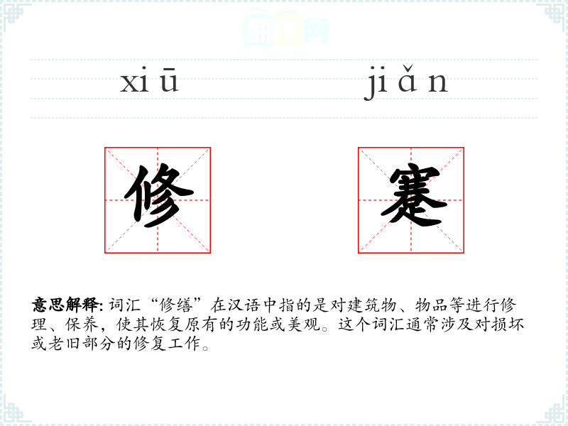 词汇“修缮”在汉语中指的是对建筑物、物品等进行修理、保养,使其恢复原有的功能或美观。这个词汇通常涉及对损坏或老旧部分的修复工作。