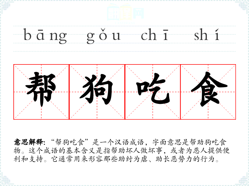 “帮狗吃食”是一个汉语成语,字面意思是帮助狗吃食物。这个成语的基本含义是指帮助坏人做坏事,或者为恶人提供便利和支持。它通常用来形容那些助纣为虐、助长恶势力的行为。