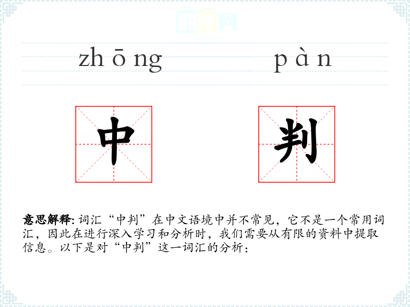 - 反义词:无(由于“中判”不是一个常用词汇,反义词不明确)