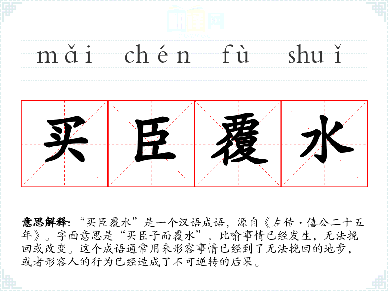 “买臣覆水”出自《左传·僖公二十五年》,原文是“买臣而覆水”,后来逐渐演变成现在的成语形式。在古代,这个成语用来形容君主的错误决策或行为已经造成了不可逆转的后果。随着时间的推移,这个成语的含义逐渐扩展,用来形容各种无法挽回的情况。